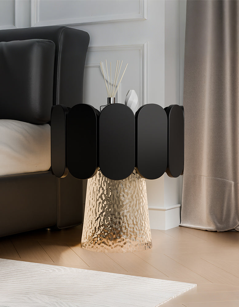 The Aurex Halo Bedside Table blends modern design with practical lighting and hidden storage. Its sculptural base diffuses a soft ambient glow, creating a warm halo effect that elevates any bedroom. The rounded tabletop provides space for lamps, décor, or night-time essentials, while the integrated storage area keeps books, devices, and personal items neatly organised.